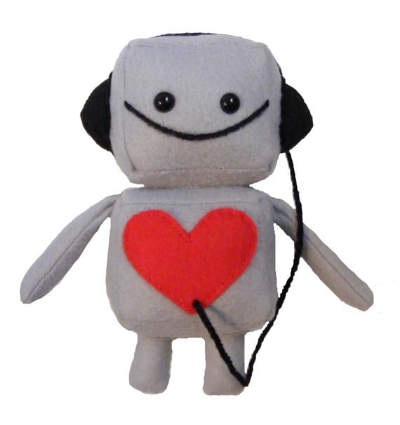 If you like the bigger one, then you'll love his little knock-off. This super cute 6" tall completely hand sewn robot is made of gray felt, black fleece, 100% polyfiber fill, yarn, embroidered black mouth and safety eyes.